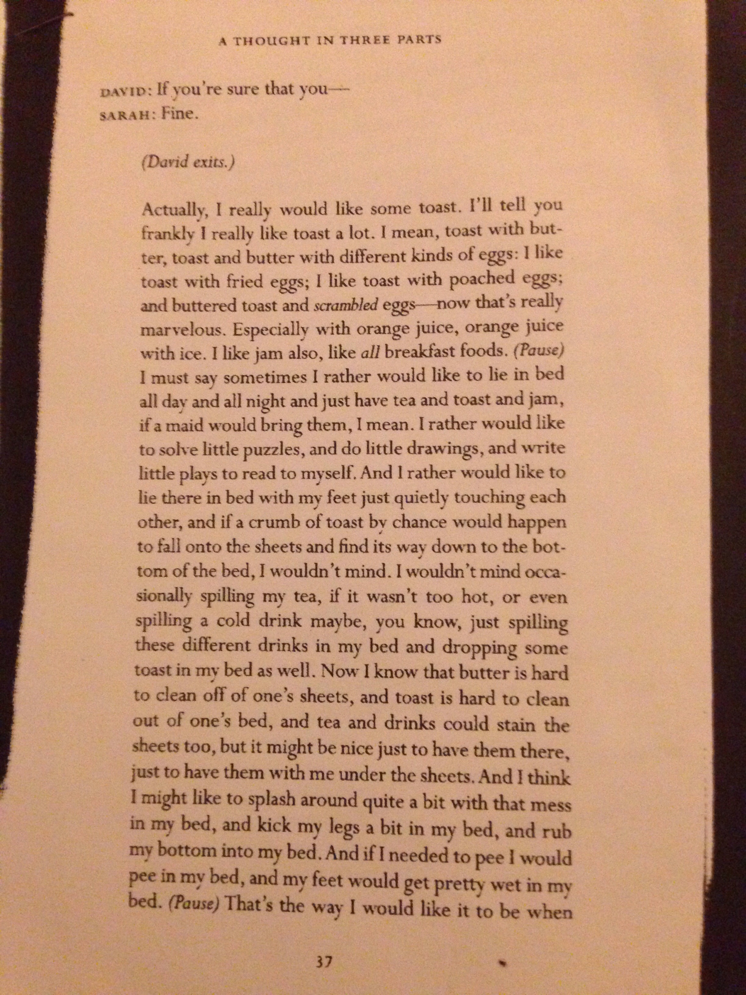 December 28, 2013December 28, 2013 A Thought In Three Parts One of my favourite speeches ever, from the first third of the play, A Thought In Three Parts by Wallace Shawn who is one of my favourite writers. Neat-oh! Share this: Click to share on X (Opens in new window) X Click to share on Facebook (Opens in new window) Facebook Like Loading... Related